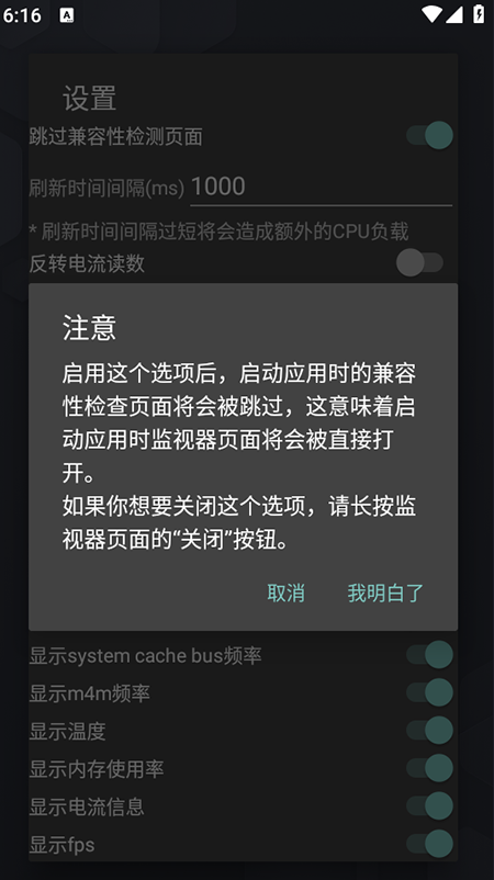 9、兼容性与问题排查:启动时会自动检测设备支持的监测项目,明确标注“支持/不支持”,并提示“不支持项可能因设备硬件或SELinux阻挠”,帮助用户快速定位功能失效原因。