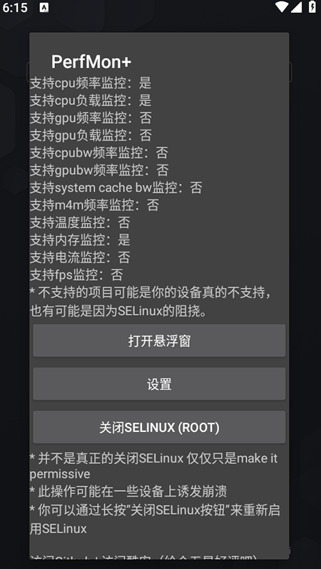 若设备支持,可开启“显示温度”“显示FPS”等进阶监测项,若勾选后无数据显示,可尝试通过“关闭SELinux”(需Root)解决,长按该按钮可恢复SELinux状态。
