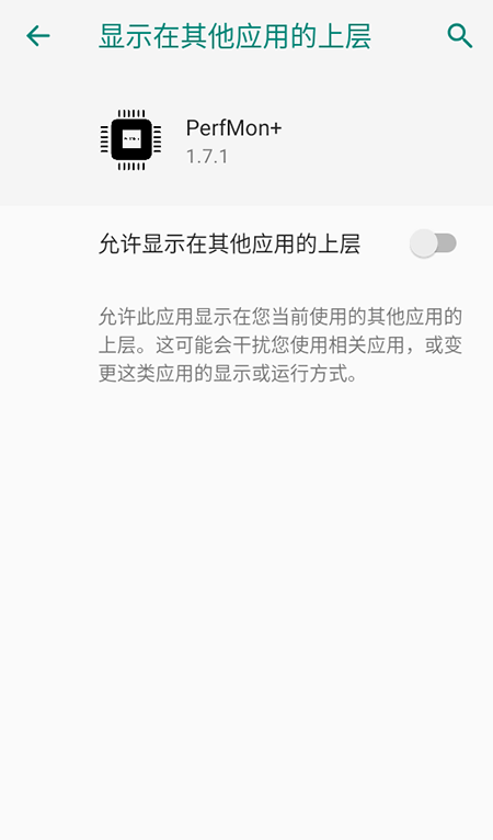 检查是否已授予“显示在其他应用的上层”权限,进入设备“设置→应用管理→PerfMon+→权限”中手动开启;