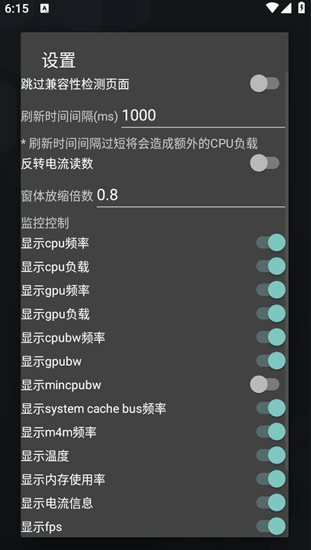4、可选监测项:根据设备支持度,可开启GPU频率/负载、cpubw频率、gpubw频率、systemcachebus频率、m4m频率、温度、电流信息、FPS(帧率)等监测,部分项可能因设备硬件或SELinux限制无法启用。