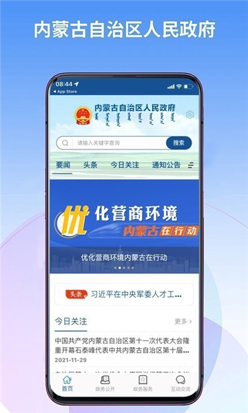 内蒙古自治区人民政府客户端提供了便捷的服务信息,及时的新闻动态,最新的政策信息,第一时间权威发布内蒙古自治区人民政府领导同志重要会议、考察、调研活动等政务信息,同时面向社会提供与政府业务相关的服务,建设基于新媒体的政府与公众互动交流新渠道。