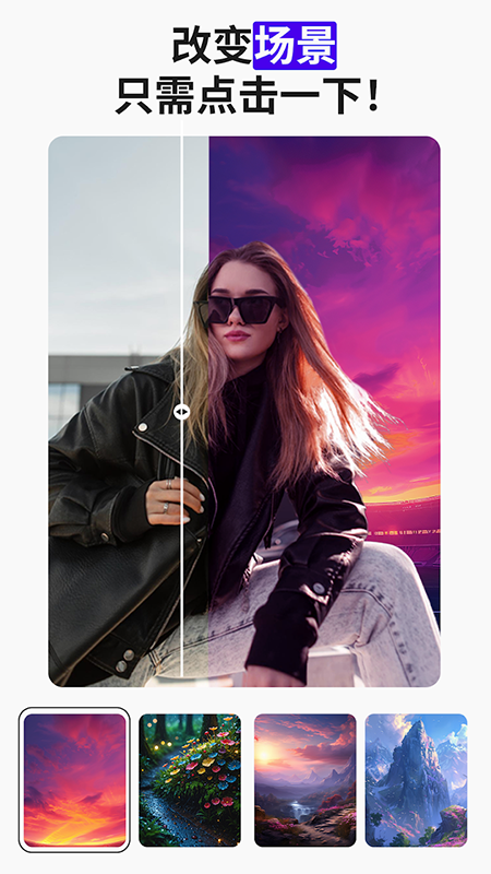 4、一键删除原照片背景,支持替换为风景、城市景观、纯色或自定义图片,适配产品宣传、个人写真美化场景。