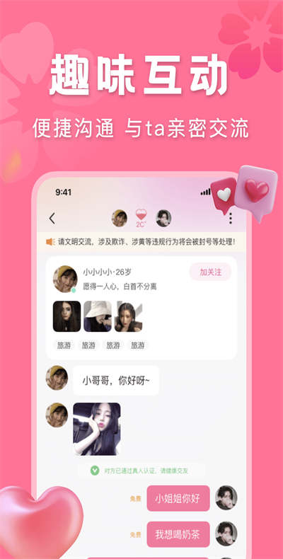 互动沟通功能:支持文字、语音、视频聊天,还有“小纸条”趣味破冰工具,避免尬聊;视频聊天可直观展示真实形象,提升彼此信任感。