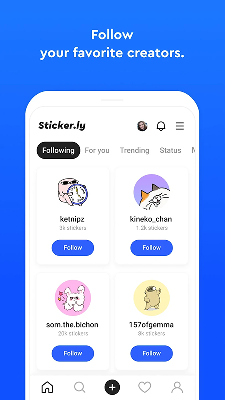 2、Stickerly搭建创作者社区,用户可关注艺术家获取持续素材,也可自己成为创作者分享作品。