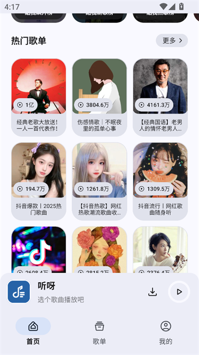 听呀APP是款纯净无广告的免费听歌及下载神器,它为用户准备了海量歌单以供挑选,还具备便捷的自由搜索功能。用户既能轻松定位到心仪的歌曲,又能借助批量下载功能迅速将喜爱的音乐存至本地,且汇聚了全平台的优质歌曲资源,充分满足大家的听歌诉求。