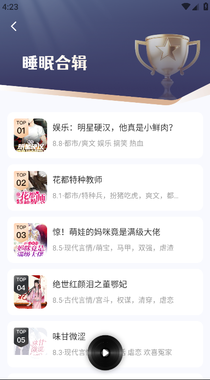 懒猫免费听书app以有声小说为核心内容,资源丰富且类型多样。题材上覆盖玄幻、历史、悬疑、青春校园、都市言情、古风恋爱、重生复仇等,满足不同用户的阅读偏好,比如“压寨郎君是我哥”“下辈子不再嫁你”等热门有声小说均有收录。同时,软件设有热榜排行、精选推荐、每日听单等板块,实时更新高分作品,像“我只想要一生一世”“重生八零嫁首长”等评分9.8分的都市爱情类小说常年上榜,方便用户快速找到优质内容,且所有小说资源均免费提供,无需担心付费门槛。