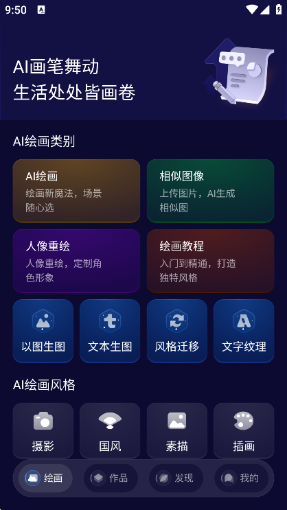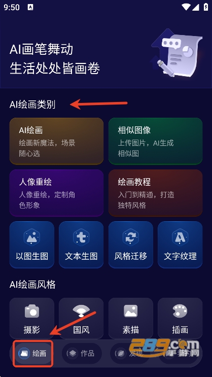 打开app,用户们可以在绘画页面挑选自己需要的AI工具