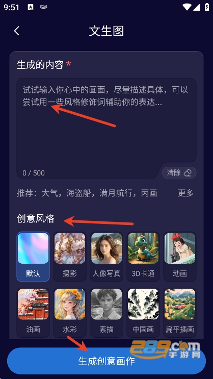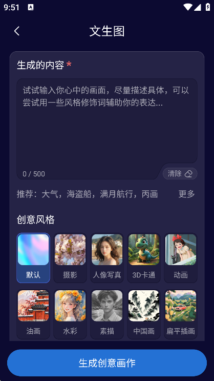 例如用户们可以使用“文本生图”工具,用户们只需要输入图片内容和图片风格,再点击“生成创意画作”即可