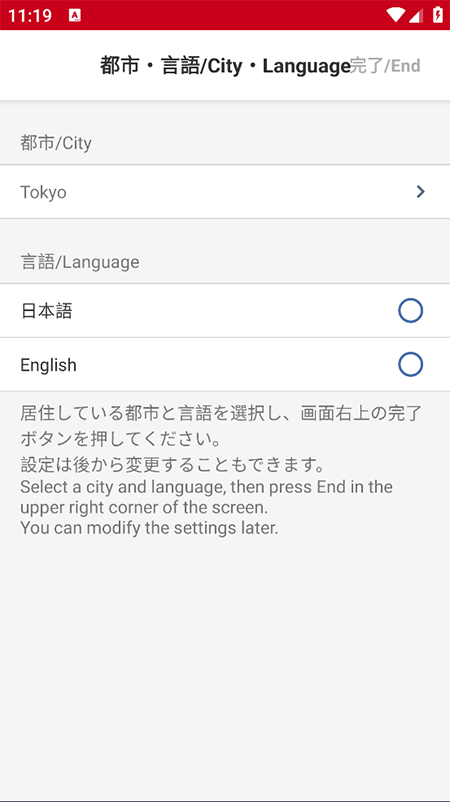 下载并安装日本航空APP,打开后进入“都市・语言”选择页面;
