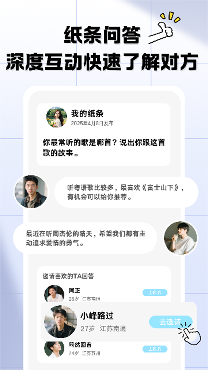 场景化社交与活动内容:线上设有“纸条问答”话题库,涵盖音乐故事、爱情观等深度话题,用户可发布或邀请他人回答,通过观点交流判断契合度;线下聚焦长三角城市,定期举办“音缘相会派对”“热辣火锅局”“剧本杀”等活动,同步更新活动报名情况与过往活动回顾,形成“线上破冰-线下见面”的完整社交内容链。