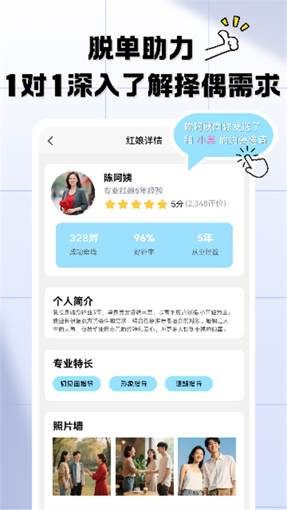 专业红娘服务内容:配备5年以上经验的专业红娘团队,个人主页展示红娘牵线成功率、好评率及擅长领域,提供1对1择偶需求分析与约会邀约协助,同时附带用户对红娘的真实评价,帮助用户选择合适的脱单指导服务。