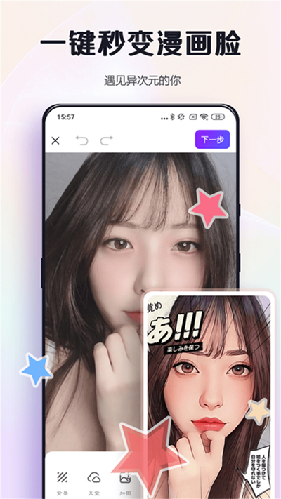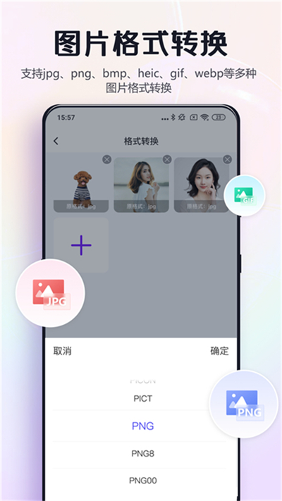 全场景修图素材库:涵盖基础编辑(裁剪、滤镜、文字贴纸)、格式转换(JPG/PNG/HEIC等百余种格式)、创意特效(漫画风、3D艺术、性别转换)三类核心素材,配套证件照背景模板、朋友圈排版模板等场景化资源,适配不同修图需求。