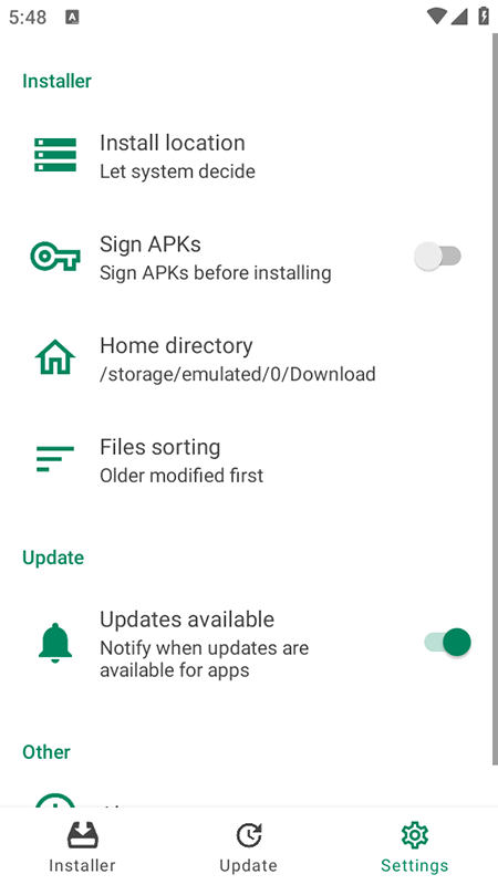 4、可调整安装位置、开启APK签名、设置文件排序方式等。