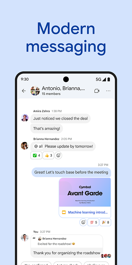 GoogleChat是一款面向团队协作的即时通讯与协作工具,Google Hangouts的升级替代产品,有基础通讯、AI增强、团队协作、安全与数据管理等功能,支持多设备跨平台使用,满足个人与团队的即时沟通需求,又能通过多样化协作功能提升工作效率。