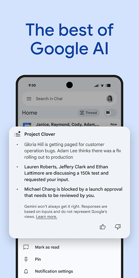 2、搭载GeminiAI助手,可自动总结对话内容、在Drive中查找文件、解答问题、brainstorm创意想法。