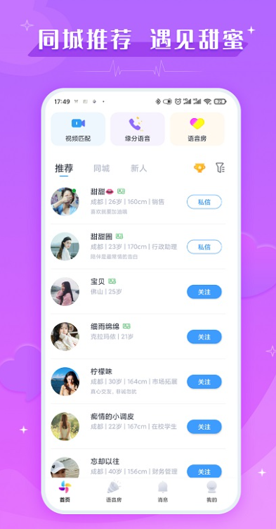 轻量化与低门槛:体积小,占用手机内存少,老旧机型也能流畅运行;操作逻辑清晰(首页推荐、语音房互动、消息管理),新手无需复杂学习,注册后即可快速开启匹配,适配年轻人快节奏社交需求。