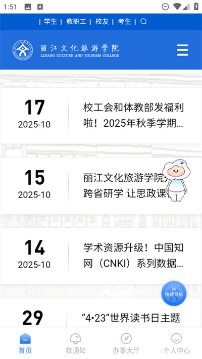 全量同步学院官网资讯,信息维度全覆盖:实时同步学院官网所有资讯内容,涵盖学校概况、机构设置、校园环境、招生就业等全方位信息;资讯更新与官网保持一致,确保师生能快速获取权威、完整的校园动态,无需在多平台间切换查询。