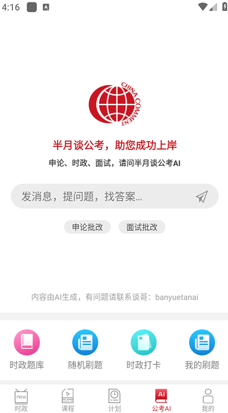 京ICP备16044242号-3A半月谈是一款公务员公考学习平台,在软件内有国考、省考、事业单位等公职类考试备考需求,近十年公考真题、优质视频课程、科学督学系统等,软件申论与行测两大科目提供全方位学习支持。