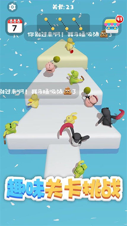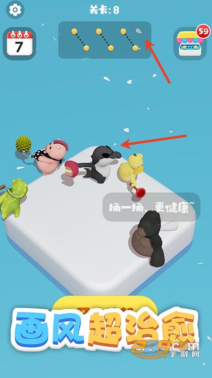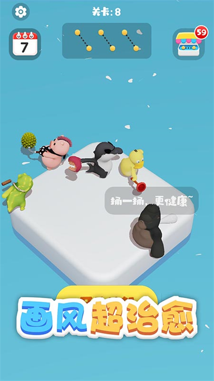 萌系角色与视觉体系:角色设计主打软萌风格,蒜头与小鸟拥有圆滚滚的身形,被分隔后会做出瞪眼歪头、原地转圈等呆萌反应,搭配粉嫩、清新的场景配色,部分关卡还融入热梗彩蛋,如动物吵架时的气泡对话框呈现趣味文字。