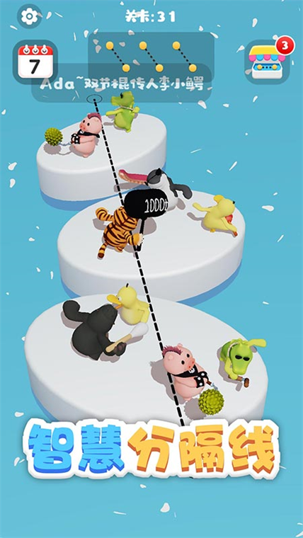关卡目标与星级机制:基础目标为“无冲突通关”,进阶目标需达成“线条最短”“分隔区域最少”等条件,满足进阶目标可获三星评价;部分关卡设有隐藏挑战,如用单条曲线分隔所有动物,达成后解锁额外道具奖励,激励玩家探索最优方案。