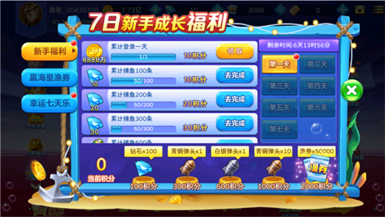 1、利用新手福利快速起步优先完成7日新手成长福利任务,首日领取8888万金币后,专注“累计捕鱼100条”等基础任务,解锁青铜弹头、渔券等道具。