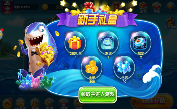 新手玩家登录游戏即可领取免费的新手礼盒,然后玩家可以点击“快速开始”,沉浸式畅游深海捕鱼世界