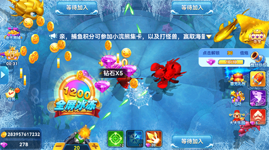 2、支持超高倍炮台,搭配追踪、冰冻、全屏炸弹等特殊技能,大幅提升捕鱼效率与爽感。