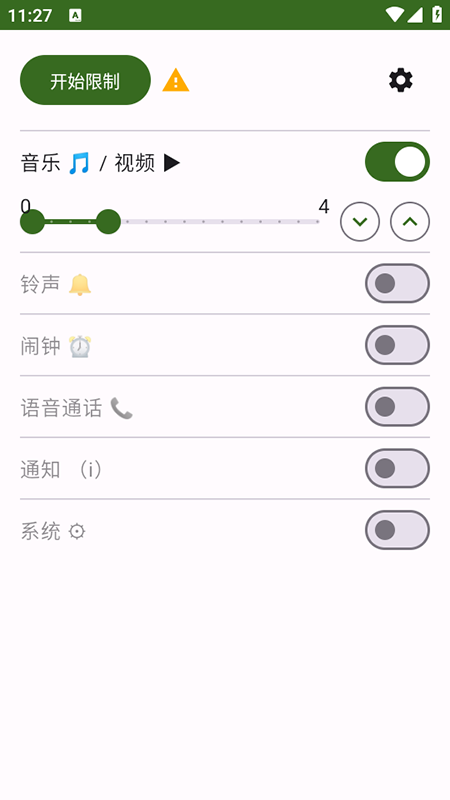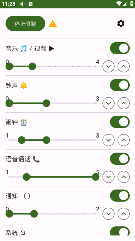 1、可针对音乐/视频、铃声、闹钟、语音通话、通知、系统等不同类型的音量进行限制设置。