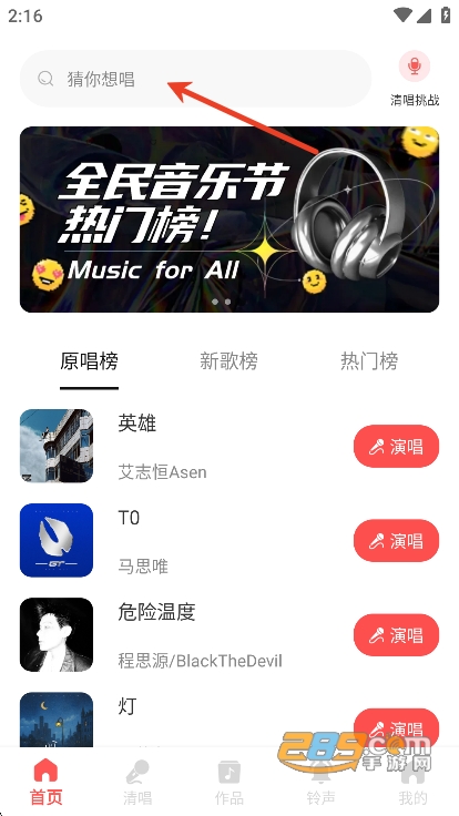 打开app,用户们可以在首页搜索栏搜索自己要演唱的歌曲