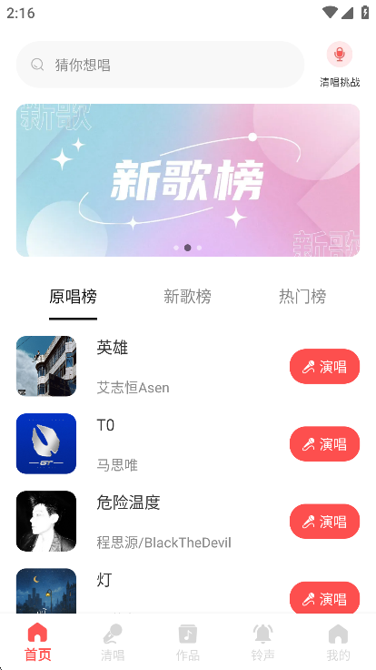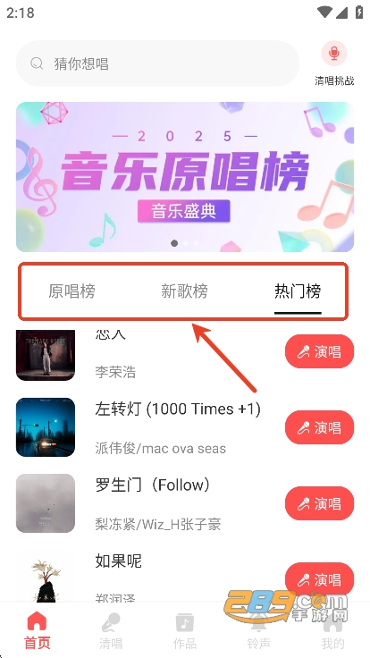 用户们也可以直接在歌曲版单里面挑选自己喜欢的歌曲进行演唱,有原唱榜,新歌榜和热门榜