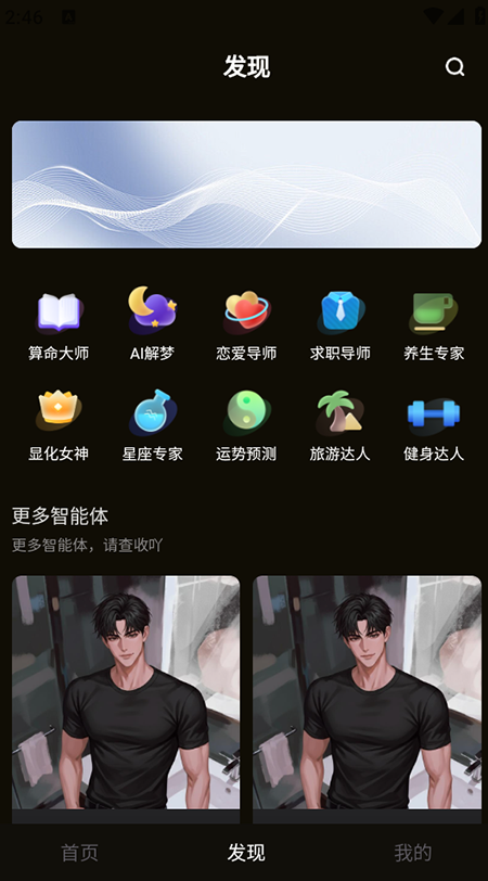 5、设有首页、发现、我的三大核心板块,支持查看聊天消息、收藏喜欢的内容,还能管理个人创建的公开或私密智能体。