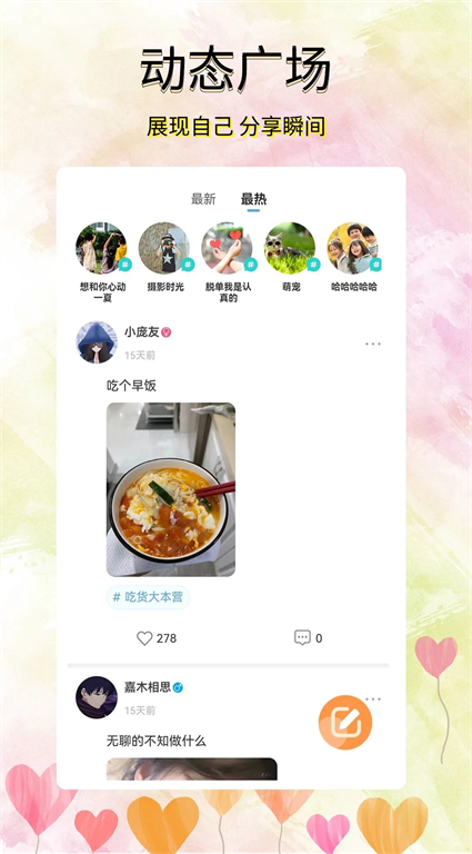 动态社区互动内容:设有“动态广场”板块,用户可发布图文动态,也能浏览他人分享的内容,通过点赞、评论展开互动;动态内容实时更新,涵盖“吃货大本营”“摄影时光”等多元话题标签,既满足用户展示自我的需求,也为兴趣交友提供话题基础。