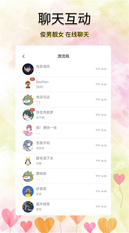 用户们可以通过漂流瓶结识与自己志趣相投的朋友,然后通过一对一聊天来增进感情
