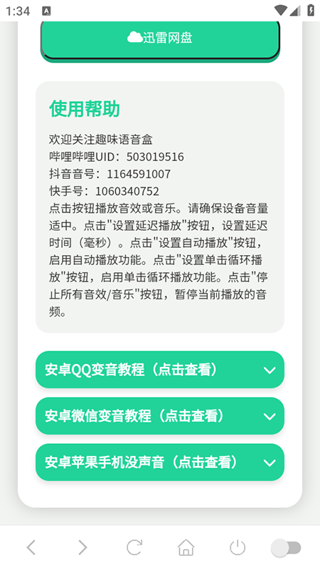 4、包含安卓QQ/微信变音教程、手机没声音问题排查指引,还标注了创作者社交账号,方便用户获取更多支持。