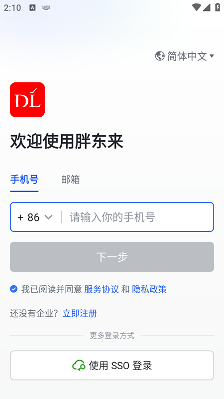 在本站内下载安装并打开软件,选择手机号或邮箱登录,勾选同意服务协议和隐私政策后点击“下一步”,也可通过SSO登录。