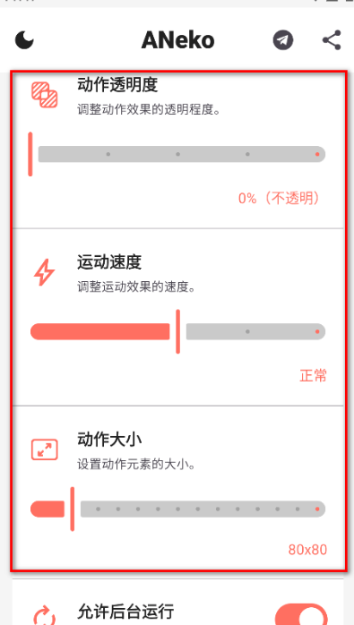 5、往下翻,根据自己的喜好来设置动作透明度、运动速度、动作大小。