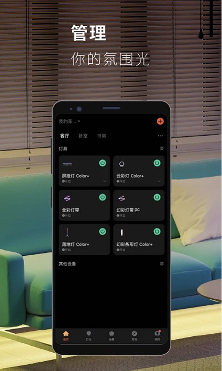 1、支持单灯/全屋灯光的亮度、色温、色彩调节,可精准匹配阅读、睡眠、聚会等不同场景。