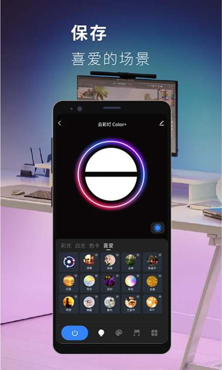 2、由照明专家设计动态淡彩光场景,覆盖“入睡、起床、会客、阅读、观影”等生活场景,同时包含节日主题、自然主题场景,秒切氛围。