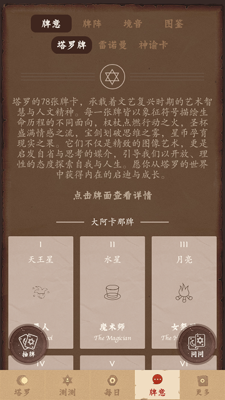 2、定期更新牌阵教程、运势解读内容,新增卡牌功能。