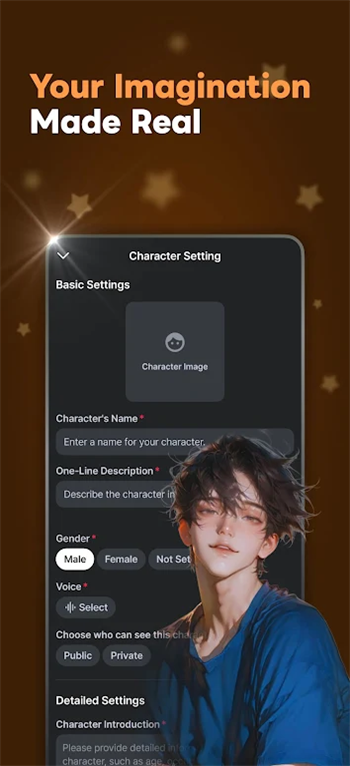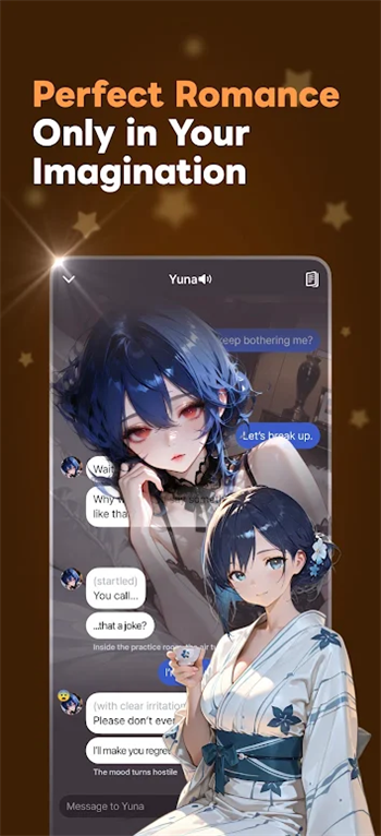 多模式互动沟通功能:支持文字输入与语音交流两种方式,语音采用自然语音合成技术,语调贴合角色性格,让互动更具真实感;内置“场景化互动引导”,根据角色题材自动推荐聊天方向(如恋爱角色推荐情话互动、奇幻角色引导剧情创作),避免冷场。