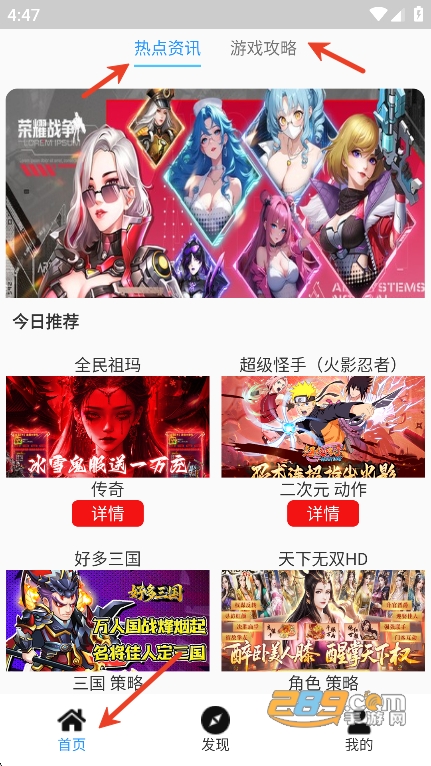 打开app,用户们可以在首页查找自己需要的游戏攻略和随时了解游戏最新资讯