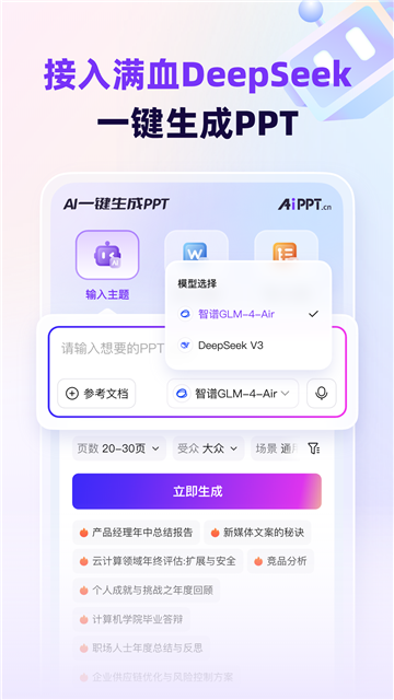 AI一键智能生成。基于人工智能大模型和自然语言处理技术,分析用户输入的主题,并快速生成符合主题要求的PPT内容。只需输入需求主题或文档资料,我们的全流程AI技术就能自动为你生成专业级高质量PPT作品。