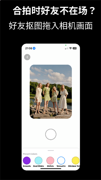 抠图合成拍摄:可导入任意抠图素材叠加至相机画面,轻松实现异地好友合拍、创意元素点缀,解锁个性化拍摄玩法。