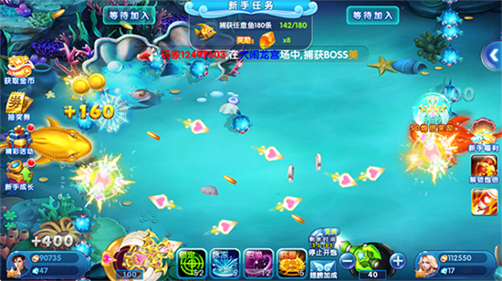 支持多人实时联机组队,创建专属房间邀请好友开黑,同步显示队友捕鱼战绩,协作触发团队福利 buff。